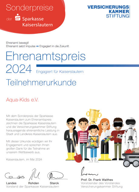 Am 10. Juni 2024 bekamen die Aqua-Kids im Rahmen einer Feierstunde einen Sonderpreis der Versicherungskammer und der Sparkasse Kaiserslautern für herausragende ehrenamtliche Leistung in Stadt und Landkreis überreicht (2. von rechts, 1. Vorsitzender Gerd Backhaus von den Aqua-Kids e.V.). Wir bedanken uns für die damit verbundene Spende bei der Stiftung. Besonderen Dank verdienen aber unser ehrenamtlicher Vorstand, die Trainer, Kampfrichter und die vielen selbstlosen Helfer, ohne die die Jugendarbeit für über 200 Kinder und Jugentliche nicht möglich wären. Daher ermutigen wir alle Mitglieder und Eltern im Verein aktiv mitzuwirken und unseren Kindern damit ein positves Vorbild für gesellschaftliches Engagement zu sein. Wir bieten z. B. die kostenlose Teilnahme zur Ausbildung zum Trainer und Schwimm-Kampfrichter an. Erweitern Sie Ihren Horizont und helfen Sie mit das Selbstbewußtsein, die Gesundheit und die soziale Kompetenz unserer Jugentlichen positiv zu beeinflussen. Melden Sie sich bei Interesse noch heute an, bei Herrn Gerd Backhaus (Kontaktinformationen siehe unter Rubrik Kontakte) und gestalten Sie aktiv die Zukunft unserer Jugend mit.