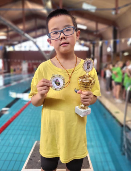 Zikai Lin hat im Freizeitbad Azur das Schwimmern erlernt. Mit Wassergewöhnung wurde angefangen. Gleitübungen folgten. Zu den Kraulbeinen kamen die Armbewegungen dazu. Ebenso wurde das Brustschwimmen erlernt. Am 5 März 22 konnte Zikai sein Seepferdchen im Empfang nehmen. Durch regelmäßiges besuchen der Trainingsgruppen in Landstuhl, Schulzentrum Süd in KL und dem Azur konnte er seine Schwimmstile verbessern und die ersten Medaillen bei kindgerechten Wettkämpfen erschwimmen. Am 1. Dezember 24 startete Zikai mit drei Girls aus dem Verein bei den Rheinland-Pfalz Meisterschaften in Oggersheim. Hier trug er einen wesentlichen Teil dazu bei dass die Staffel am Schluss mit großem Vorsprung den ersten Platz erzielte. Alle Trainer sind stolz auf unsere Kinder. Aquakids Go, Go, Go!!! 1. Dezember 2024 Zikai als Rheinland-Pfalz Staffelmeister