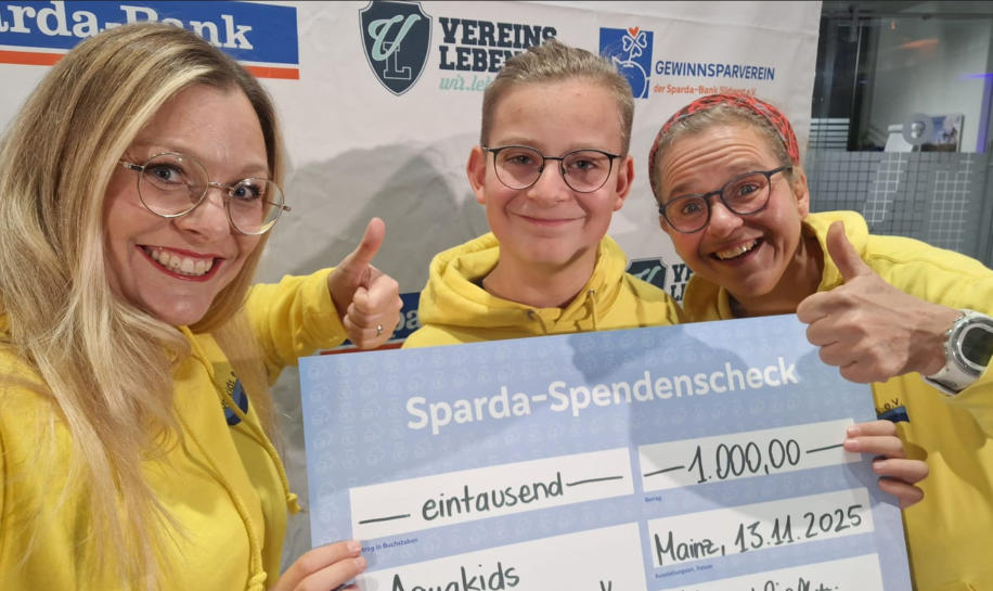 1000 € für den Verein (Mainz, 13.11.2025). Verein des Monats 3. Platz. Überreichung des Preisgeldes in Mainz. Große Freude und Stolz herrscht beim Schwimmverein Aqua - ids e.V.! Der Verein sicherte sich im Mai den dritten Platz bei der renommierten Auszeichnung „Verein des Monats” von vereinsleben.de. Mit diesem Erfolg gewinnt der Verein ein Preisgeld von 1.000 Euro für seine engagierte Jugendarbeit. Der Wettbewerb im Mai war in diesem Jahr besonders hart umkämpft. Die Aqua-Kids mobilisierten jedoch ihre gesamte Gemeinschaft und erzielten dabei ein herausragendes Ergebnis: Der Mai war der stimmenstärkste Abstimmungsmonat seit Beginn des Wettbewerbs, was die beeindruckende Unterstützung der Mitglieder, Eltern und Fans eindrucksvoll belegt. Ein Tausender für die Nachwuchsförderung „Wir sind überwältigt von dieser Unterstützung”, erklärt Kirstin Rogel, 2. Vorsitzende des Vereins, als sie den Erfolg kommentierte. „Jede einzelne Stimme zählt, und dass wir in einem so starken Monat den dritten Platz erreicht haben, zeigt, wie tief unsere Arbeit in der Gemeinschaft verwurzelt ist. Ein riesiges Dankeschön geht an alle, die uns mit ihrem Klick unterstützt haben.” Zur Preisverleihung wurde Kirstin Rogel vom männlichen Teamcaptain, Yannis Mahl, und einer Elternvertreterin, Julia Mahl, begleitet. Das gewonnene Preisgeld von 1.000 Euro soll gezielt in die Förderung des Nachwuchses investiert werden. So gab es bereits einen großen Zuschuss zum Trainingslager im Sommer und im Herbst. Mehr als nur Schwimmen Die Aqua- Kids sind bekannt für ihre umfassende Arbeit, die über das reine Schwimmtraining hinausgeht. Neben der Vermittlung wichtiger Schwimmtechniken legen die Trainer und Betreuerinnen großen Wert auf Teamgeist, Disziplin und Persönlichkeitssförderung. Die Auszeichnung „Verein des Monats” würdigt nicht nur die sportlichen Erfolge, sondern auch das soziale Engagement des Vereins. Mit dem Schwung dieses Erfolges blicken die Aqua Kids optimistisch in die Zukunft und hoffen, weiterhin viele Kinder und Jugendliche für den Schwimmsport begeistern zu können. Die Community hat bewiesen: Wenn es darauf ankommt, stehen sie voll hinter ihrem Verein.
